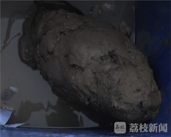 这枚疑似爆炸物直径约有60厘米,因为刚刚被挖出,上面还裹着一层泥巴。据工地上的工人说,他们的挖掘机是在一个土坑施工时挖出的这个大家伙。