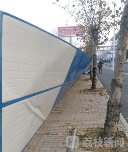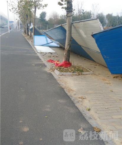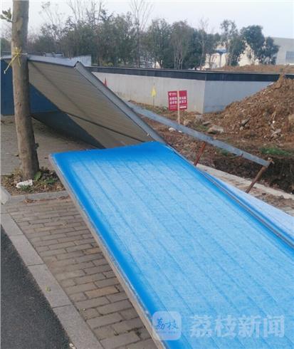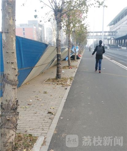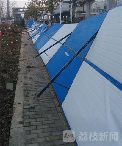 昨天(12月5日)南京受大风影响,部分地区阵风风力达8级以上,晚上刮起的大风,致使南京六合大道大厂地铁站附近一施工工地近百平米围挡被大风掀倒在人行道上,好在当时没有人通过这里,否则后果不堪设想。据一位乘坐地铁的林先生讲,昨天晚上风确实也太大了,他正好下地铁出来,就看到这里围挡“轰隆'一声倒下了,把自己吓得不轻,庆幸自己离得远没有被砸到。目前倒下来的围挡占用部分人行道影响行人通行,希望有关部门尽快处理,以免给市民通行带来影响。
