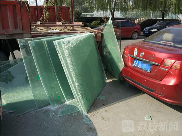 12月7日中午12:50分左右,南京南通路118号门前,一辆装载玻璃的大货车正在路边卸货时,车上一整捆玻璃突然意外滑落,正好砸中旁边1名正在作业的工人,工人被砸后头部受伤严重,脸部、手部均被划破出血。玻璃倒落后,还顺带砸中了旁边停靠的一辆红色别克,别克左后尾部被砸凹陷,车身多处漆面划伤,在场工人随即报120,小车司机同时报警。