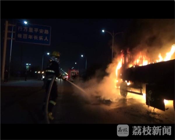现场,货车车厢正在熊熊燃烧,火很快蔓延到前面的驾驶室,赶到的消 防队员立即拿来高压水枪堵截火势、冷却油箱。