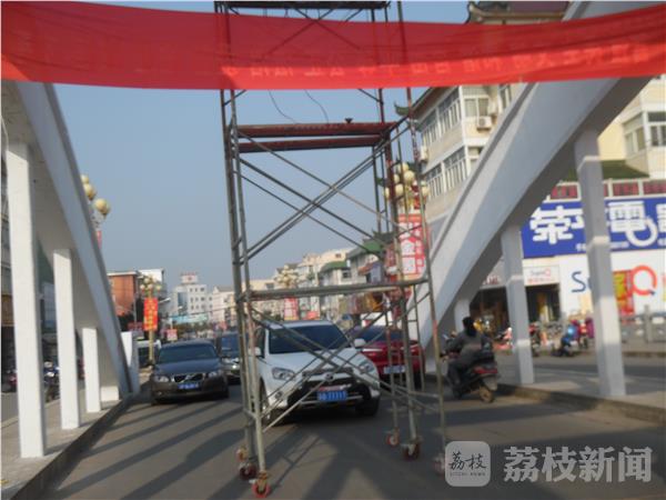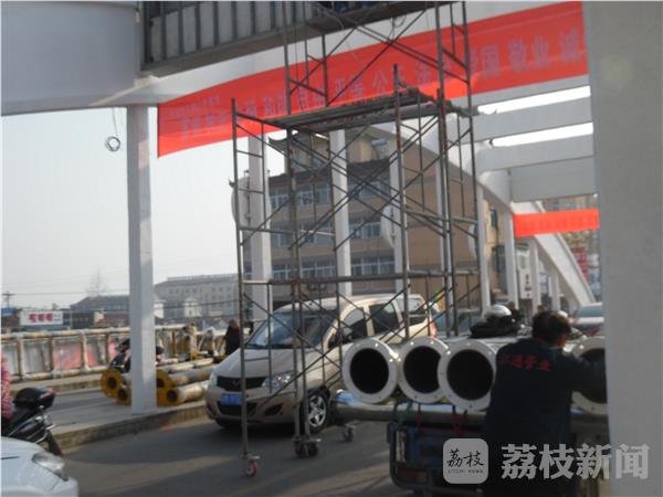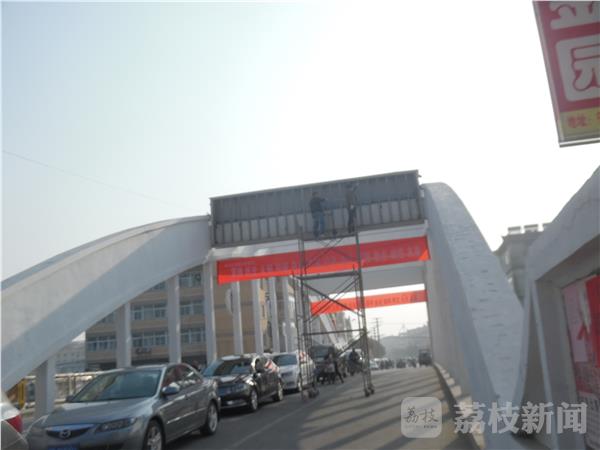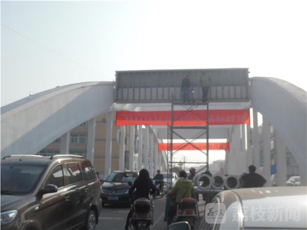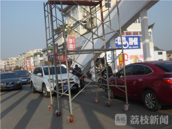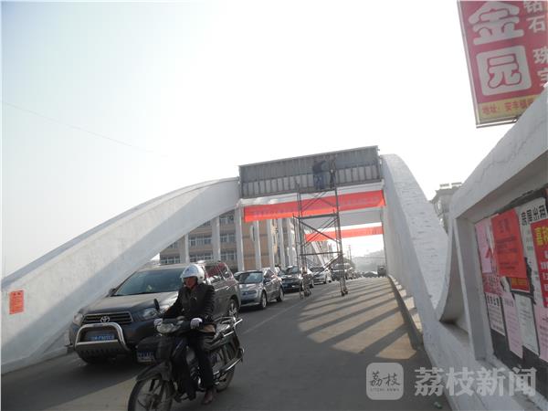 12月8日下午经过兴化安丰振安桥的时候发现,两名工人正在修理拱桥上的LED大屏,可是他们的脚手架放在桥的中间部分,两边连警示标志都没有。由于脚手架占据了1/3的路面,车辆行驶非常缓慢,而且由于没有警示标志,后方来车一不小心就会撞在脚手架上,存在着很大的安全隐患。我们希望当地城管部门能够加强维修安全管理。确保维修安全,交通畅行。