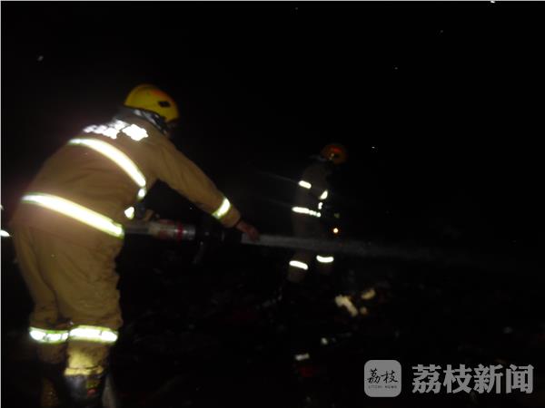荔枝新闻通讯员接到报料赶到现场时发现明火已经被消防队员扑灭,消防队员正用水枪对着厚厚的还有灰烬的硬纸板进行灭火。由于纸板比较密集加上火势较大,消防队员用水枪对硬纸板进行稀释降温,然后用铁耙将硬纸板一块块翻开,最终降服了火魔,目前火灾具体原因消防队员正在调查了解之中。