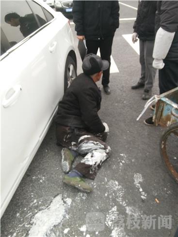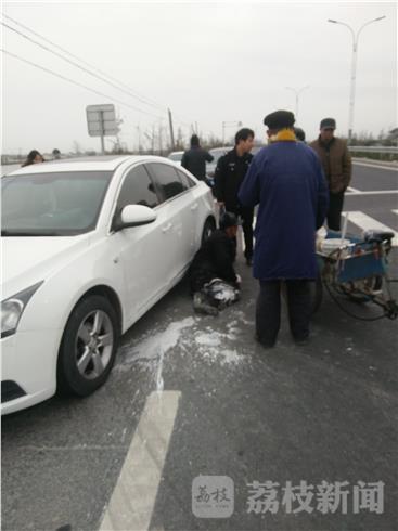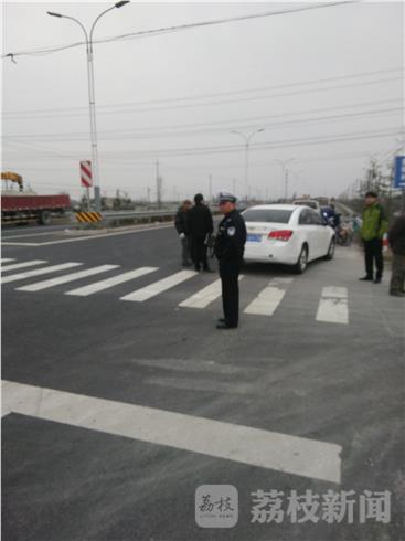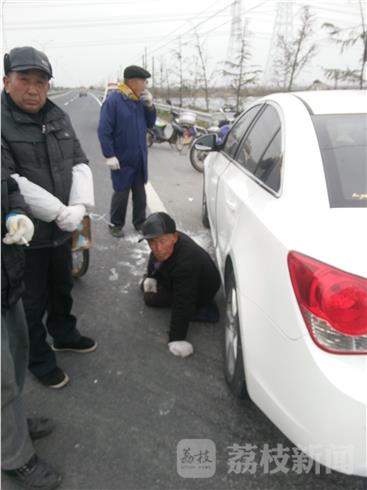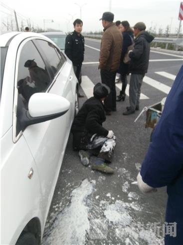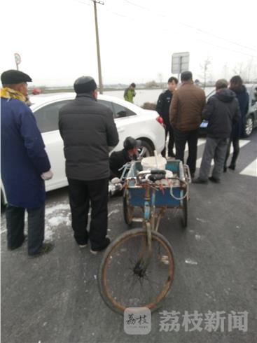 笔者路过现场时,看见一位老人倒在白色小轿车的旁边,地上有一摊石灰,在北侧的车道里还停着一辆三轮车。据老人介绍,他由北向南准备横穿省道,一辆白色小轿车从东侧近三十米的地方过来的时候他停顿了一下,但是小轿车还是一下子撞倒了三轮车,他也跟着倒下去。