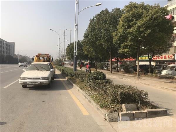 “我们小区门口的人行道长期停放着一辆僵尸车,这条巷子本身就不宽,上下学、下班高峰时,影响很大。请你们对车辆进行清拖”。交警一大队工作人员接到市民来电后,立即派民警去现场了解车辆情况。当交警来到仙鹤门时,看到这辆白色的大众轿车横着停放在人行道上,车身也锈迹斑斑多处损坏,四个车胎干瘪,由于长时间没有移动,车牌已经不知所踪,车头都长出了杂草。随后交警组织清障车对“僵尸车”进行拖移,把车辆拖移到公共停车场。