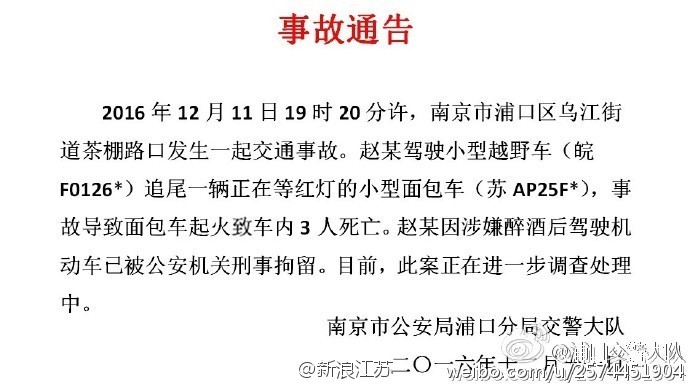 浦口交警大队凌晨发布事故通报,肇事司机涉嫌醉酒后驾驶机动车已被刑拘。