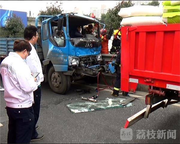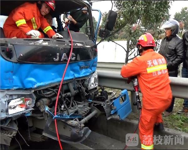 2016年12月12日下午3点,无锡市锡山区锡虞路与312国道交界处发生一起交通事故,两辆货车追尾,后车驾驶员被困在驾驶室中无法动弹。接到报警后,救援人员迅速赶往现场进行处置。