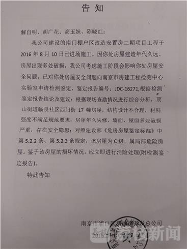 国浩律师(南京)事务所律师 叶珈睿:委托机构没有权利进行房屋安全鉴定,他不是产权人也不是拆迁单位只是第三人,委托主题有问题,即使鉴定为C级也要看房主是什么意见,是怎么消除危险。居民的私有财产应该受到保护,任何人不得以任何形式侵占房屋。