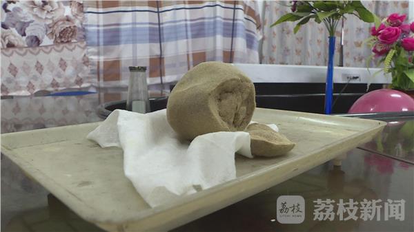 刚见到记者,张师傅就欣喜地展示起了刚刚从羊肚里取出的宝贝。只见这个球状物体泛着土黄色,足足有一个成年人拳头那么大,表面看上去毛绒绒的,摸上去软软的,湿湿的。从破损处,还能看到内部的絮状物体。张师傅说,这个球状物是前几天杀羊的时候,在羊肚里发现的。