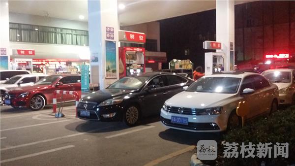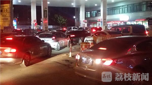 今天晚上9时许,荔枝新闻网友在南京龙蟠中路的公园路中石化加油站看到,这里的8个加油枪在呼呼地吐油,每个加油枪前都排着等待加油的众多车辆。等待加油的各种车辆挤得里三层外三层的,车辆队伍长达数百米,延龙蟠中路已排到了瑞金路、常府街路口。