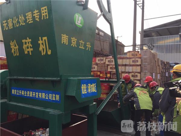 荔枝全媒体记者:孙茂强 12月14日下午,南京市工商局采用环保、无害化的方式,公开销毁了13类160余个品种、价值金额560余万元的假冒伪劣商品。现场不乏假冒“LV”、“五粮液”、“奔驰”等名牌的伪劣商品。在南京立升公司厂区内销毁现场,所有待销毁的假冒伪劣商品分门别类整齐摆放。工作人员将假冒伪劣商品按照食品、衣着日用品、电子电器、机械类等不同类别,先通过外力冲击、浸泡、切割等手段,破坏假冒伪劣商品的使用价值,然后再作分类处理,回收再利用或作无害化处理。