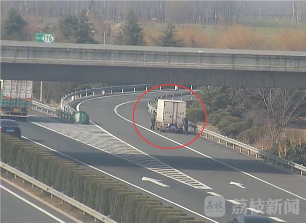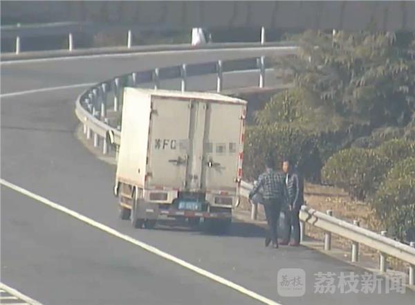当天中午,民警通过监控发现在淮徐高速安方向176公里处发现一辆苏F牌照的白色厢式货车停在应急车道上,而车后有两名男子,其中一名男子竟然从路边拿起了一块石头。