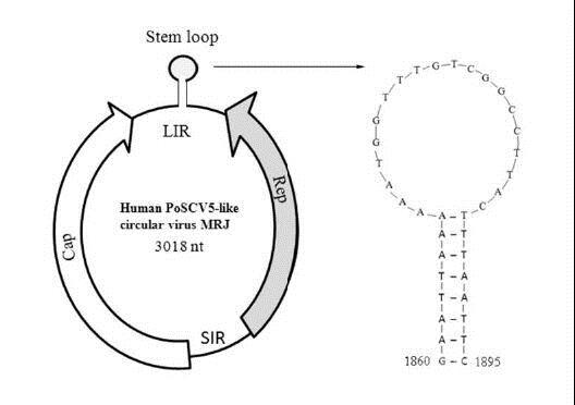近期,江苏检验检疫局与江苏省卫生计生委联合对口岸既往多份发热患者的生物样本进行宏基因组测序检测,在上述患者的生物样本中发现了一种新型环状单链DNA病毒片段,通过进一步测序、序列组装、PCR扩增,得到完整的病毒基因组。该病毒基因组全长由3018个核苷酸组成,编码2个主要蛋白。经与现有基因库比对,与该病毒最相似的为猪粪相关的环状病毒-5(PoSCV5),但其核苷酸同源性仅为84%,氨基酸同源性低于50%。经过专家复核,认为这是一种在人体首次检出的新型环状单链DNA病毒。
