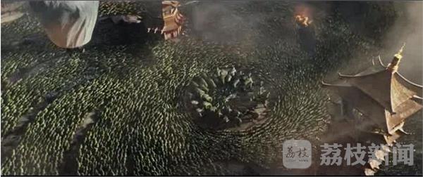 《长城》的特效全部由工业光魔操刀制作,水准也是世界一流,全片一共1191个特效镜头,占到了总片长的三分之二。片中的绝对主角饕餮,原画设计也是在改了746稿后,精心打磨出来的。要说影片中最震撼、最具视效冲击的镜头,当属三十万饕餮攻城的场景。316291只饕餮由兽王发号施令,进攻城墙,变化阵法,整齐划一,残暴凶狠又阴险狡诈,令人不寒而栗。