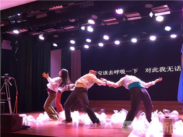 “呼……呼……”舞台上两个姑娘粗重的呼吸声在剧场内弥漫,所有观众都被被雾霾裹挟,突然两个姑娘突然倒下,在满地充满空气的塑料袋中里疯狂的寻找,希望这仅剩的清洁空气能给她们以希望。演员之一的南京晓庄学院大一学生的葛康的表演方式有些特别,作为大男孩的他在舞台上细致地擦着粉底:“雾霾严重的话,化妆也是保护皮肤的步骤,不仅女生要化妆,男生也要化妆,口红化在口罩外面,因为里面看不到了,这个抽象点,有一种类似戏谑和讽刺的感觉。”