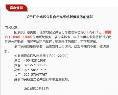 笔者从江北地区公共自行车管理部门了解到,江北地区各公共自行车公司将于2016年12月17日(星期六)上午10:00 ~下午14:00对公共自行车管理系统进行升级,暂停所有系统服务。请各位江北新区市民朋友根据需要,合理安排出行时间,给您带来的不便,敬请谅解。