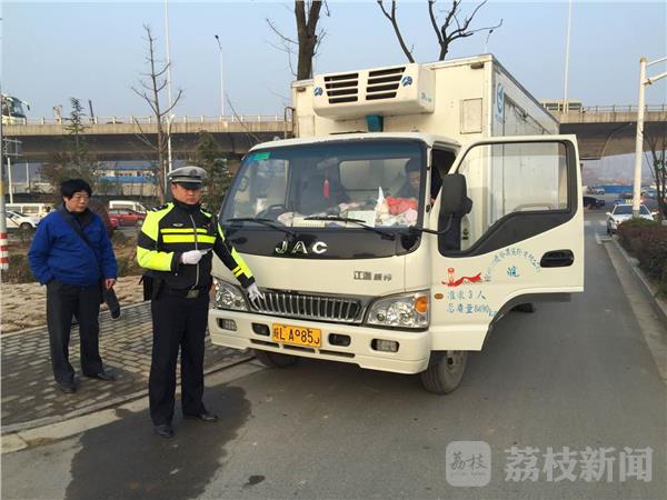 今天(12月16日)早上八点多,南京交警九大队二中队在柳新路执勤时,发现一辆安徽牌照的冷藏车,前面黄色大牌上的数字有被涂抹的痕迹。