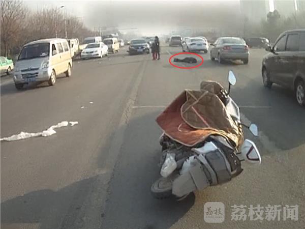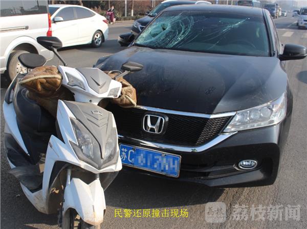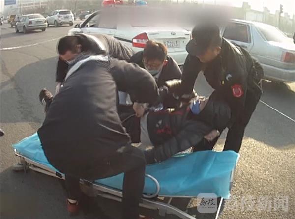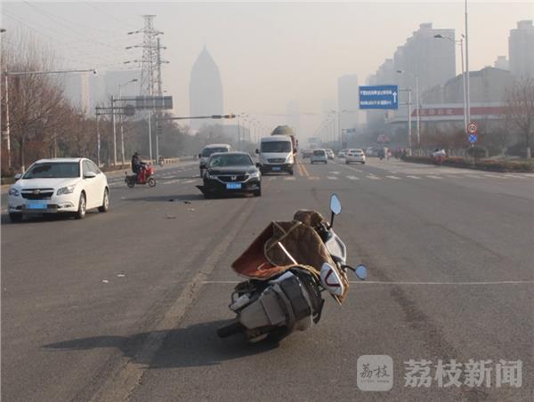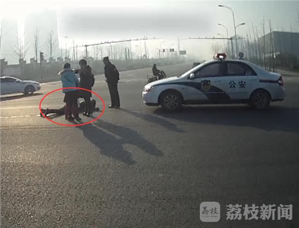 12月16日上午,在徐州市城东大道云苑路口,两名男子同骑一辆电动车,在通过三叉路口时,被一辆直行的轿车撞飞七八米远,电动车被撞飞20多米远。巡逻路过的云龙巡防大队民警一边通知120,一边用身体和警车作为警示,防止发生二次事故。