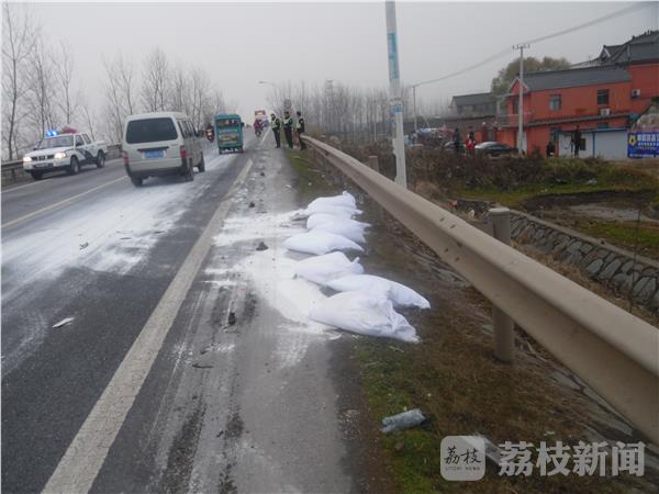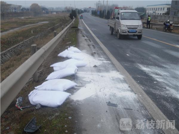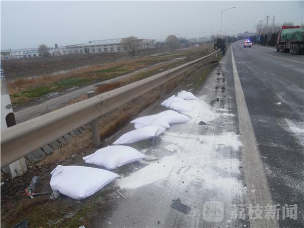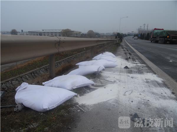 在公路西侧的护栏边掉着许多白色的石粉袋,被风一吹公路上到处散落着石粉。原来这就是红色大卡车上掉下的东西。据公路附近的一位老奶奶介绍,凌晨六点听到轰隆一声开始以为放鞭炮,出来以后才知道车辆撞。