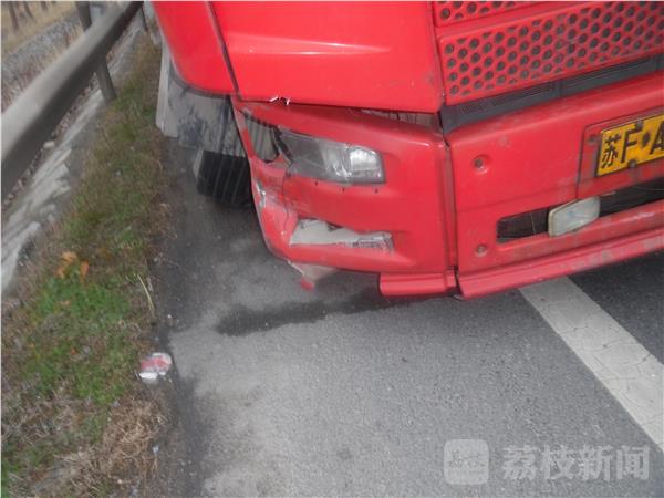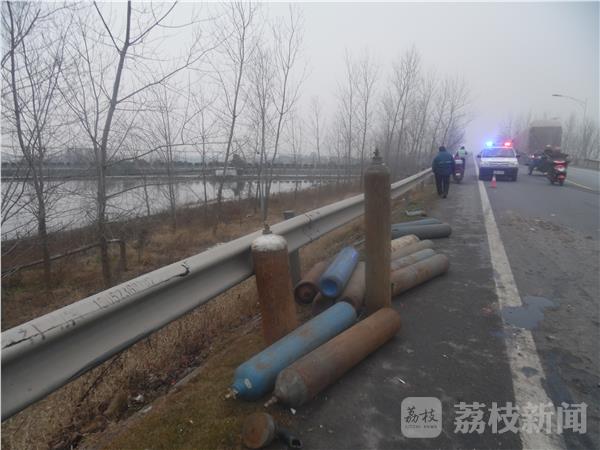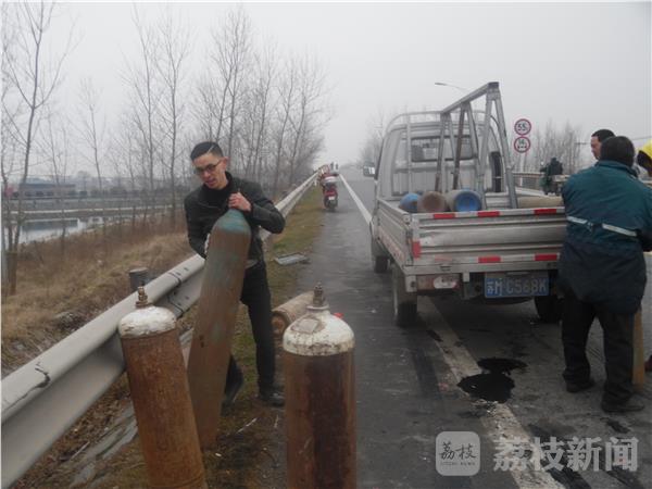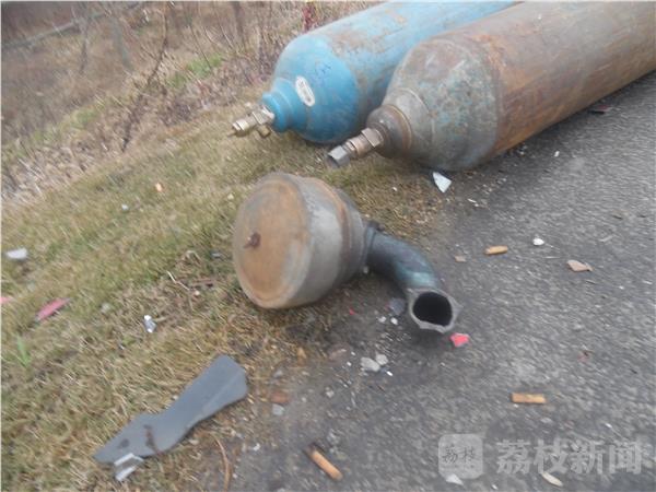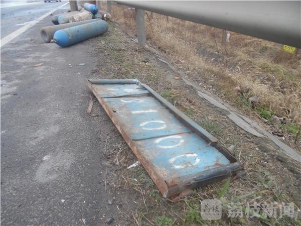 笔者赶到现场时,清障车先后将拖拉机和厢式货车拖离现场。事故发生在唐家庄高架桥北侧,只见公路东侧护栏边躺着许多钢瓶,还有几只钢瓶躺在公路护栏下面的排水沟里。公路上到处散落着拖拉机上的牌照、排气管等碎片。据拖拉机驾驶员介绍他们在超车的时候被后面的红色大卡车撞了一下,如果不是东侧的护栏挡了一下,拖拉机就会翻到公路下面,后果不堪设想。