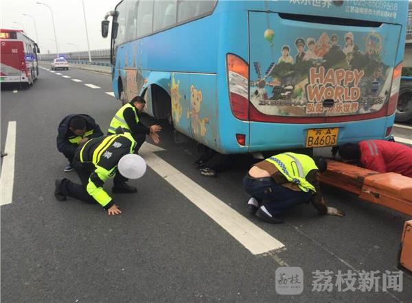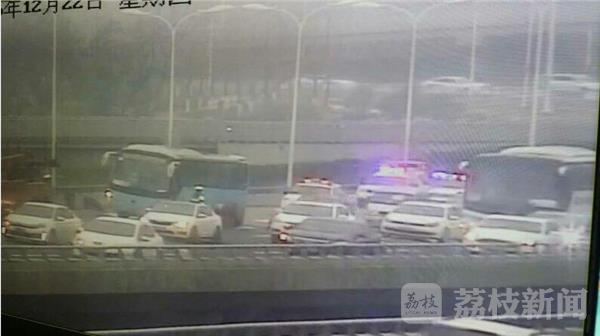 今天(12月22日)早晨,南京夹江大桥浦口往市区方向,一辆大巴车由于轮胎螺丝松动,导致轮胎掉落,抛锚停在中间一股车道,无法移动。