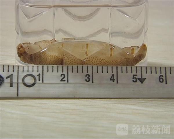 在镇江市绿化管理站记者见到了这只保存在酒瓶里的黑翅土白蚁蚁后,它长约5公分,整体呈淡黄色,显得十分肥硕。工作人员介绍,本月16号,他们发现引资大道上的行道树被白蚁啃食的现象非常严重,根据痕迹,他们在附近的绿地挖了3天,终于找到了蚁巢,取出了这只蚁后。