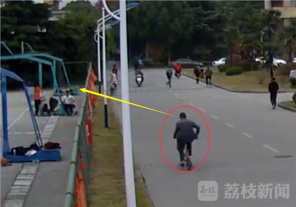 这是徐州市泉山区某高校内篮球场附近的监控,监控显示在今年12月5日下午5点左右,当时有不少学生正在篮球场打球,嫌疑人纪某骑一辆自行车先到案发现场进行踩点。纪某踩点确定好有可下手的盗窃目标后,便骑车离开,同时给同伙杨某打电话,很快杨某也骑一辆自行车到达纪某所说的篮球架下面。