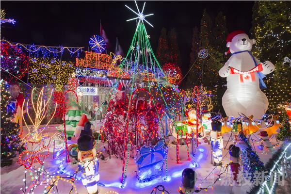 12月22日,在加拿大多伦多一户居民在门前布置了五彩缤纷的圣诞主题彩灯装饰。