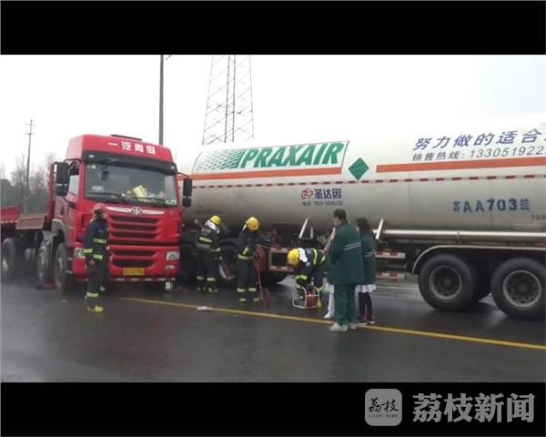 昨天(12月25日)中午11点多钟,镇江丹阳市开发区丹西公路与沪蓉高速涵洞交界处,两辆大货车相撞,有一名驾驶员被困在驾驶室,急需救援。接到报警后,开发区现役中队立即出动1辆消防车、7名消防官兵赶赴现场救援。