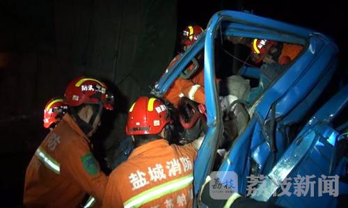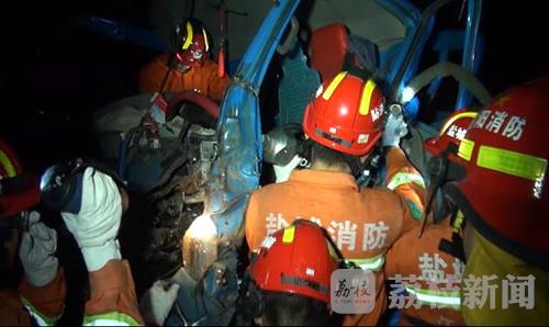 12月28日晚上10点钟左右,盐城射阳县耦耕办事处境内的兴耦大道与省道329线交汇的T型路口发生一起重大的追尾交通事故,一辆由东向西行驶的小货车疑因避让不及,追尾撞上同方向行驶的大货车,小货车驾驶员被困在变形的驾驶室里无法动弹。接到报警后,射阳公安消防大队官兵迅速赶到现场展开营救工作,但小货车驾驶员因伤情严重,不治身亡。