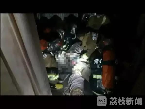 消防员在二楼窗户口发现了女店主,身上被烧伤,还有生命体征,立即利用担架将她安全抬至一楼,并送往120救治。