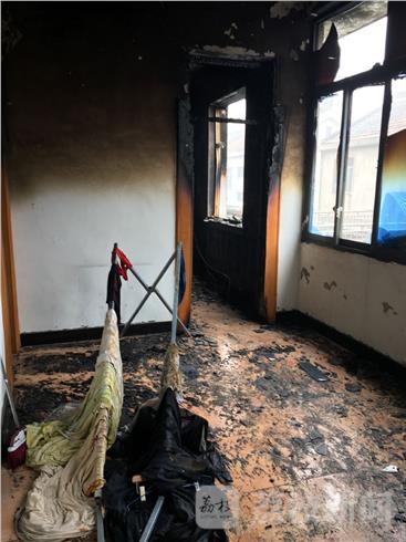 今天上午,荔枝通讯员在现场看到,失火的是一处普通二楼民居,一楼大厅满地污水,房东和房客正在往外清扫。失火的房间位于二楼的两个房间,其中二楼门窗已被大火吞噬,室内一片狼藉,室内空调、电视、衣服等所有物品都已经化为灰炭,天花板水泥被烧掉了一大块。