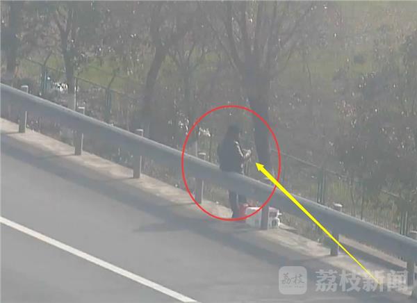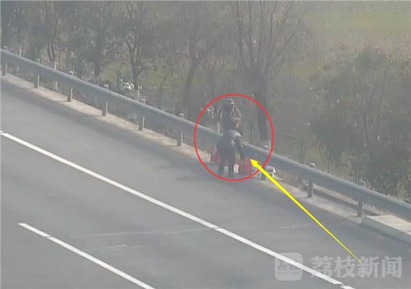 女子依靠在高速公路护栏外侧,手中正在忙着织毛衣,身边还放着一些行礼,女子还不时的观望来车方向,民警猜测女子应该是在等车。几分钟后,又来了一名男子,女子仍然在织着手中的毛衣。