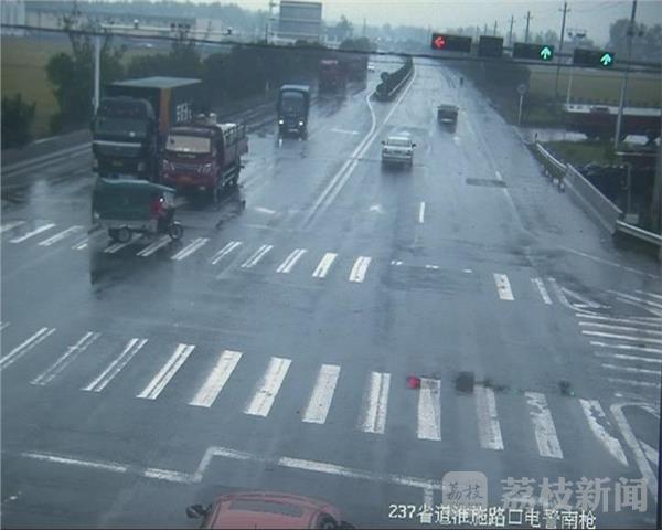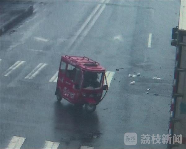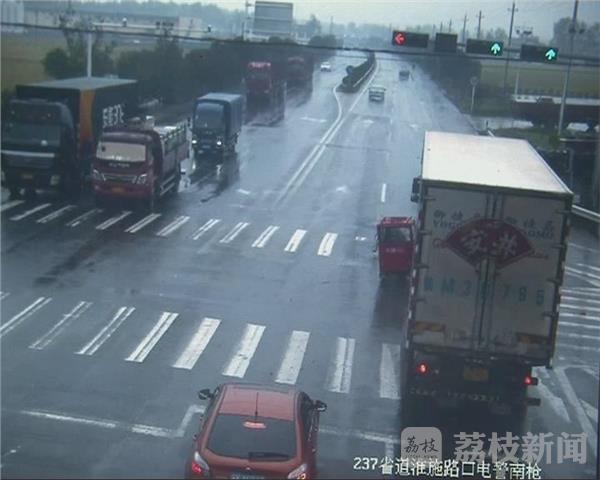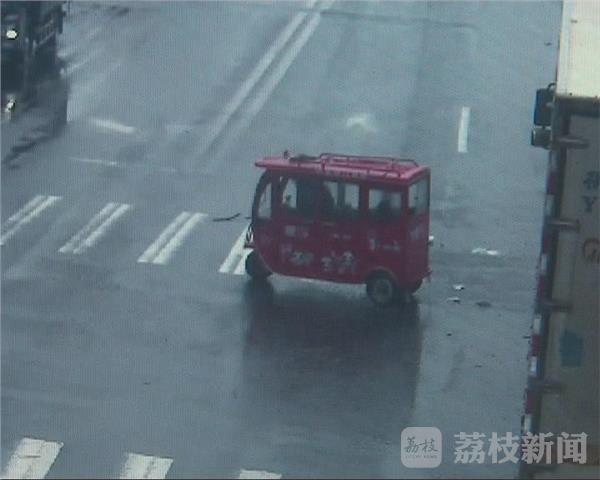 昨天(5号)下午两点多,淮安市237省道淮施路发生惊险一幕,一辆电动三轮车在通过一处十字路口时闯红灯通行,结果与一辆正常行驶的厢式货车相撞,电动三轮车车身被撞严重变形。