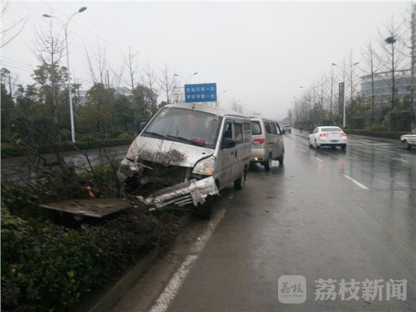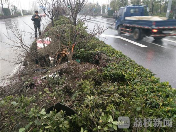荔枝新闻通讯员赶到现场时,面包车还骑在绿化带上,车辆前部分保险杠部位损坏严重,绿化带上绿化遭遇破坏,一指示牌被压倒,据驾驶员介绍,由于凌晨两点才睡觉,出来开车比较疲劳,当时行驶到这里还玩看手机不慎冲撞到绿化带上,所幸没有人员没有大碍。