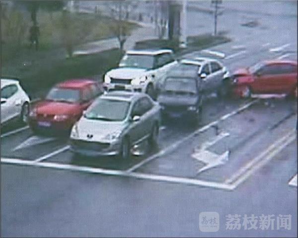 交警部门公布的监控画面显示,青墩塘路金山路口,两辆由东向西行驶的轿车,分别高速撞向前方待行的车辆,现场瞬间撞成了“一锅粥”。