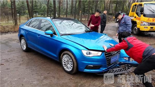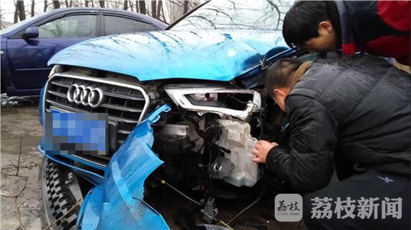 记者在现场看到,救援部门的清障车已经赶来进行施救,轿车前车部位被撞呈现敞开状,地面上散落着许多车辆撞击后的碎片,车内两只安全气囊爆出。据奥迪司机透露,该新车刚买不久,在经过这条小路时,他看到路上有很多坑洞积水,为躲开这些坑才打方向避让,谁知因泥水导致车辆打滑发生失控撞到树上。