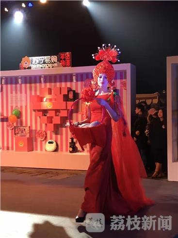 到了夜幕降临,红毯T台,灯光闪亮,一场国际范和民俗调的中西合璧“年货”走秀,更是吸引了众多百姓的“围观”。