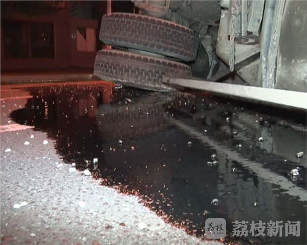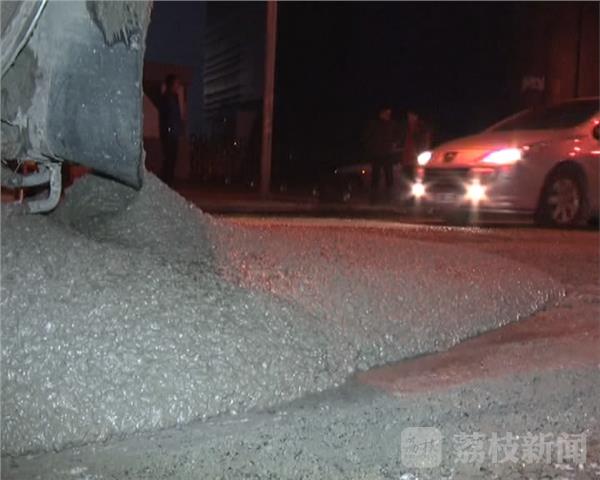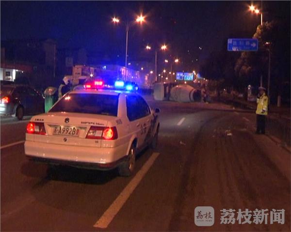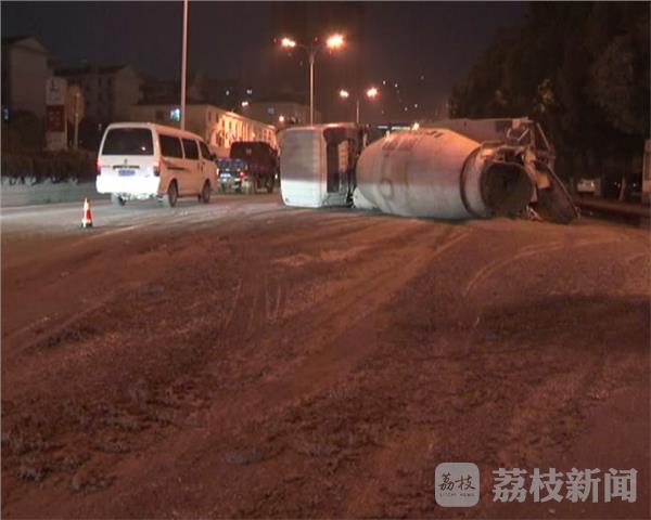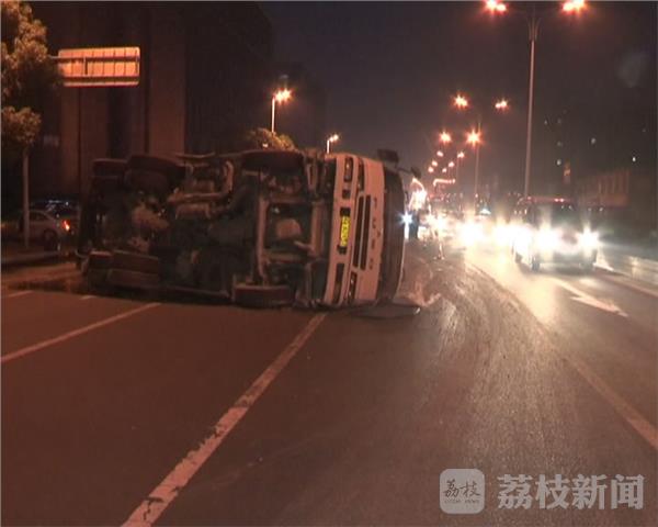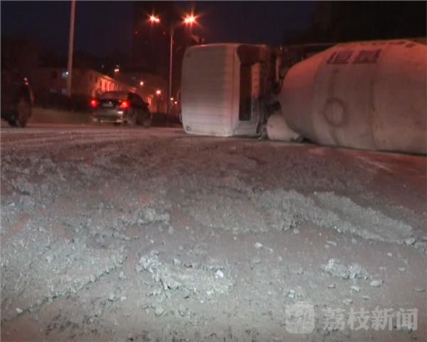 今天早上6点05分,在江宁区双龙大道和胜利路的路口,一辆由北向南行驶的混凝土搅拌发生侧翻,记者在现场看到,这辆满载混凝土的搅拌车侧翻后又滑行了几十米,占据了两股车道,车上的混凝土也从车斗里泄了出来,混着车辆泄露的机油,马路被污染的一塌糊涂,路过车辆只能减速通过。