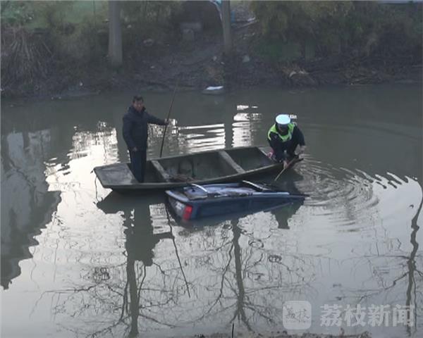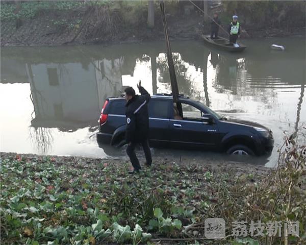 现场一辆黑色的轿车停在河中间只露出一点车顶,一位群众自告奋勇的划着小船带着大丰区刘庄交警中队民警房警官在河里用棍子对着车子的窗户试探着有没有人被困车内,就在这时一辆经过的吊车看到这个情况也主动的要求帮忙把车往岸边上吊看一下车内有没有被困人员,经过120医生确认车内没有人员被困,大家这才松了一口气。