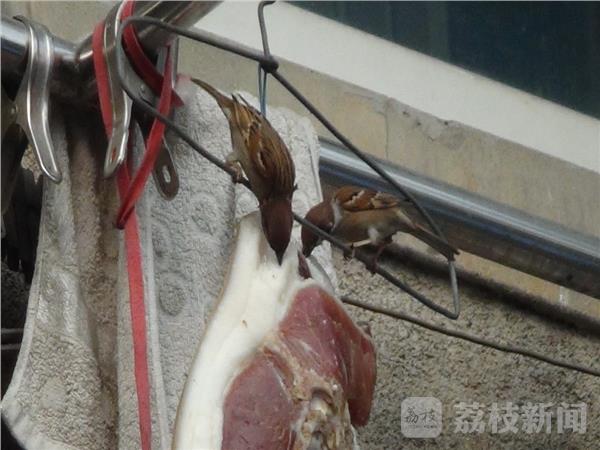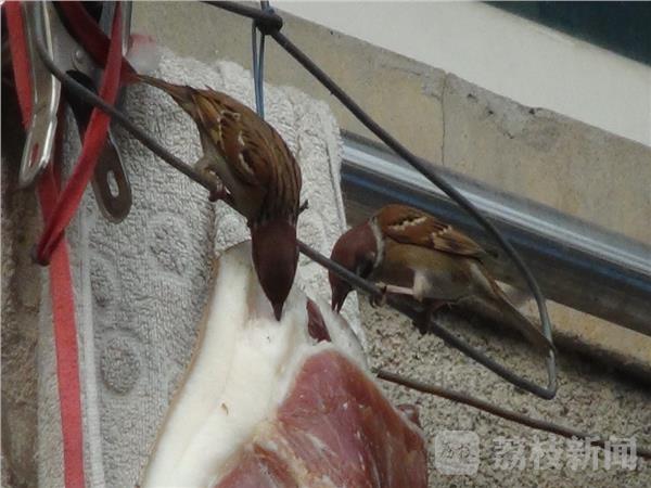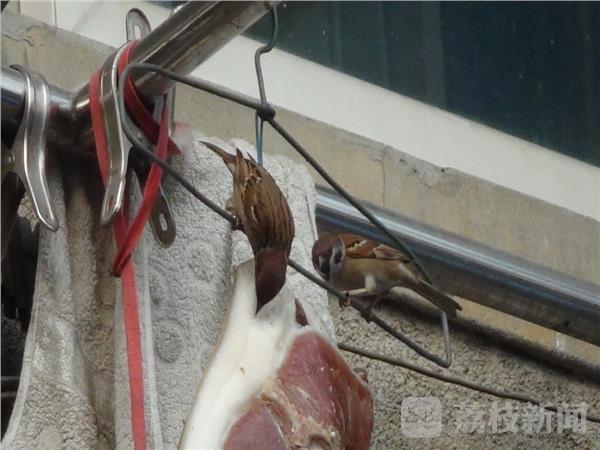 “快过年了!买几块咸肉挂在阳台上晒晒,但在白天总是被啄,为了追查“元凶”,我经过蹲守观察,才发现是被麻雀啄的。”今日,家住鼓楼区金川新寓的吴先生一脸无奈,近段时间来,他发现挂在阳台上的咸肉总是被一群麻雀偷食。