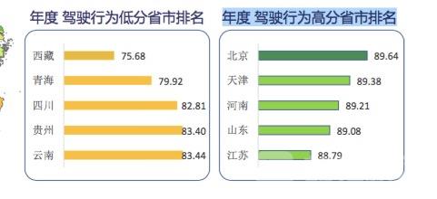 全国驾驶评分中,华北地区、东北地区、新疆地区驾驶评分较高,而华东、华南、中西部地区驾驶评分相对较低。从分布上看平原区域的驾驶评分高于山地区域。年度驾驶行为排名中,江苏在“文明”榜上排名第五。