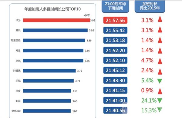 另外,根据出行目的地分析,2016年用户在工作、金融、医疗、汽车这些商务和医疗上增加较多,而在餐饮、旅游、住宿、运动这些消费领域上相比去年出行比例在变少,说明用户更注重工作,消费却更谨慎。因此,报告也首次根据高德地图大数据,得出加班最多的公司等,以18:00开始计算加班时长,华为是平均下班时间最晚的公司,直到21:57分,BAT都在加班最多公司中,而新浪2016年加班时间同比去年下降24.1%。晚十点后互联网公司周边道路依然繁忙,拥堵延时指数高于其它区域,其中奇虎360周边拥堵延时指数最高。