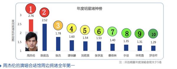 通过监测演唱会场馆周边拥堵情况,2016年周杰伦演唱会体育馆周边拥堵最为严重,在22:00—24:00这一时段平均拥堵延时指数高达2.76,是开演唱会的明星中对场馆周边交通影响最大的一位。