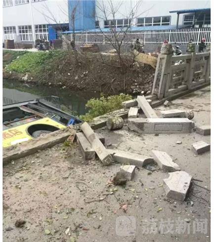 荔枝新闻网友现场看到,公交车横躺在河里,由于河水较浅车身大部分还露出外面,公交车车窗玻璃多处碎裂,公交门也损坏,河岸多根桥栏杆被撞断,不远处停着事故中一辆天蓝色轿车,轿车前引擎盖撞受损,地面全是碎玻璃。随后两辆施救车辆进行施救将公交车吊上岸。