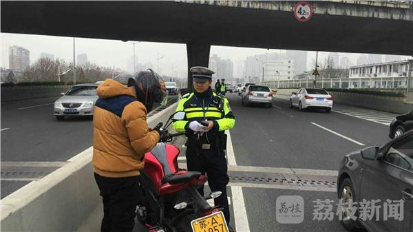 对此,警方呼吁广大驾驶人遵守交通法规,特别是春运即将来临,一些民工兄弟也准备骑摩托车返乡,请不要图摩托车上高架方便,车子开起来快,而不顾自身及他人的安全,更不能无证驾驶或驾驶无牌套牌车辆,南京交警五大队将继续对摩托车闯高架桥、隧道禁行道路的违法行为开展专项整治行动。