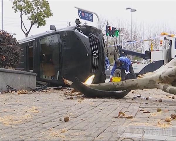 记者赶到现场后,警方已在现场拉起了警戒线。一辆奔驰越野车翻倒在路边,越野车的前引擎盖受损严重,两个安全气囊全部弹出,在事发现场还散落着不少汽车碎片,路边的一棵小树被越野车拦腰撞断。