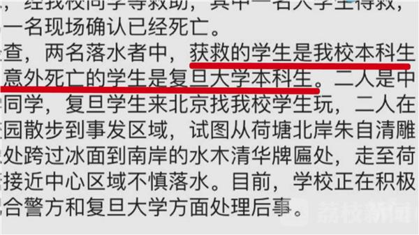 1月10日凌晨,发生在清华大学校园里荷塘上的惊魂一幕。在接近中心区域的冰面上,两名大学生遇冰裂不慎坠湖,其中一人被救了上来,另一人现场确认已经死亡。两名落水者中,获救的学生是清华的本科生,意外死亡的学生是复旦大学本科生。