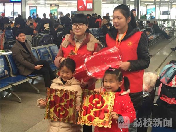 今天,苏州站的工作人员也是带来了春联和福字发给候车的旅客,为他们送上新春的祝福。现场候车的旅客中,有不少父母带着小孩,一起返乡。虽然发车时间还早,但他们还是早早的来到车站候车,这样他们才感觉离家更近一些。