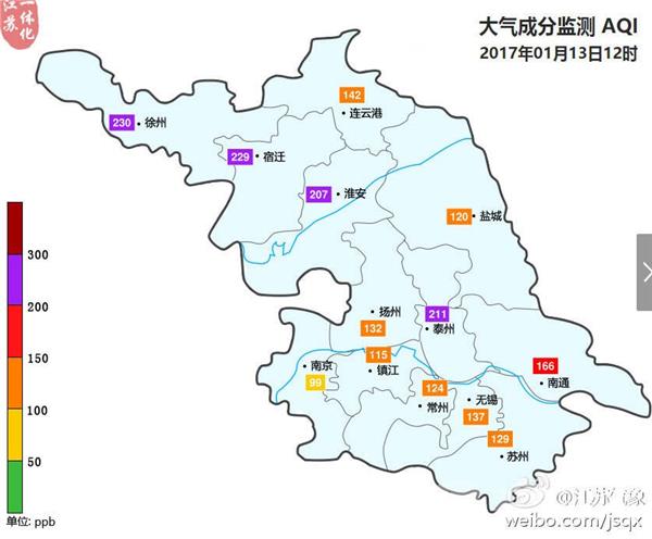 中午12点多,徐州、宿迁、淮安和泰州达到5级重度污染,全省仅有南京空气质量仍处在达标水平,其他城市空气质量全部陷入污染。