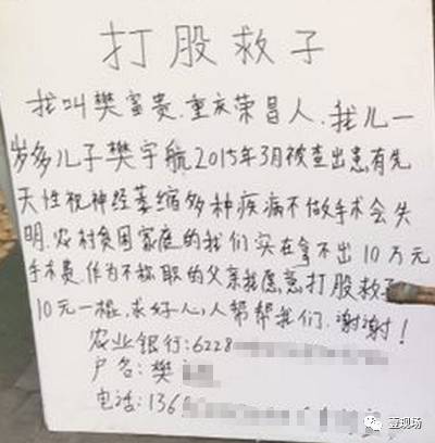 “我现在‘打股救子’也是为了想引起社会关注,希望大家能帮帮孩子。”樊先生表示,只在北京做了几天检查,已经花了七千块钱,自己只剩8千块钱左右了。